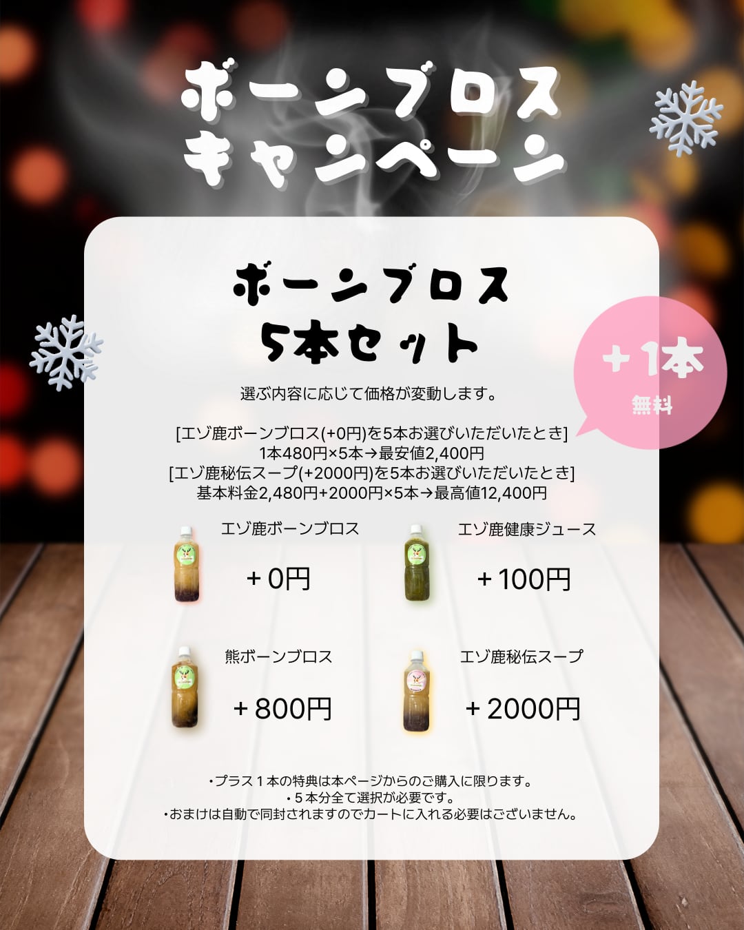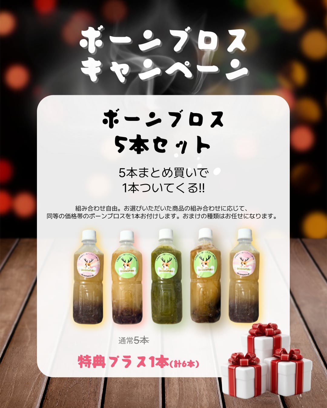 お好きなボーンブロスを5本選ぶだけで、1本おまけがついてくる特別セットです。